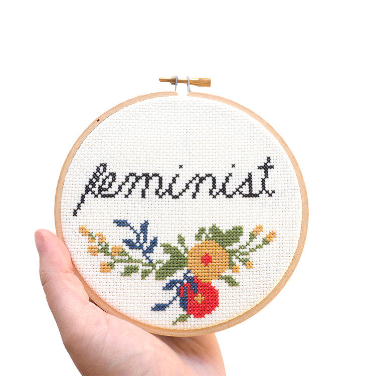 Beginner-friendly kit with "Feminist." Kit Includes:• 5" wood embroidery hoop• Printed 1 page counted cross...
