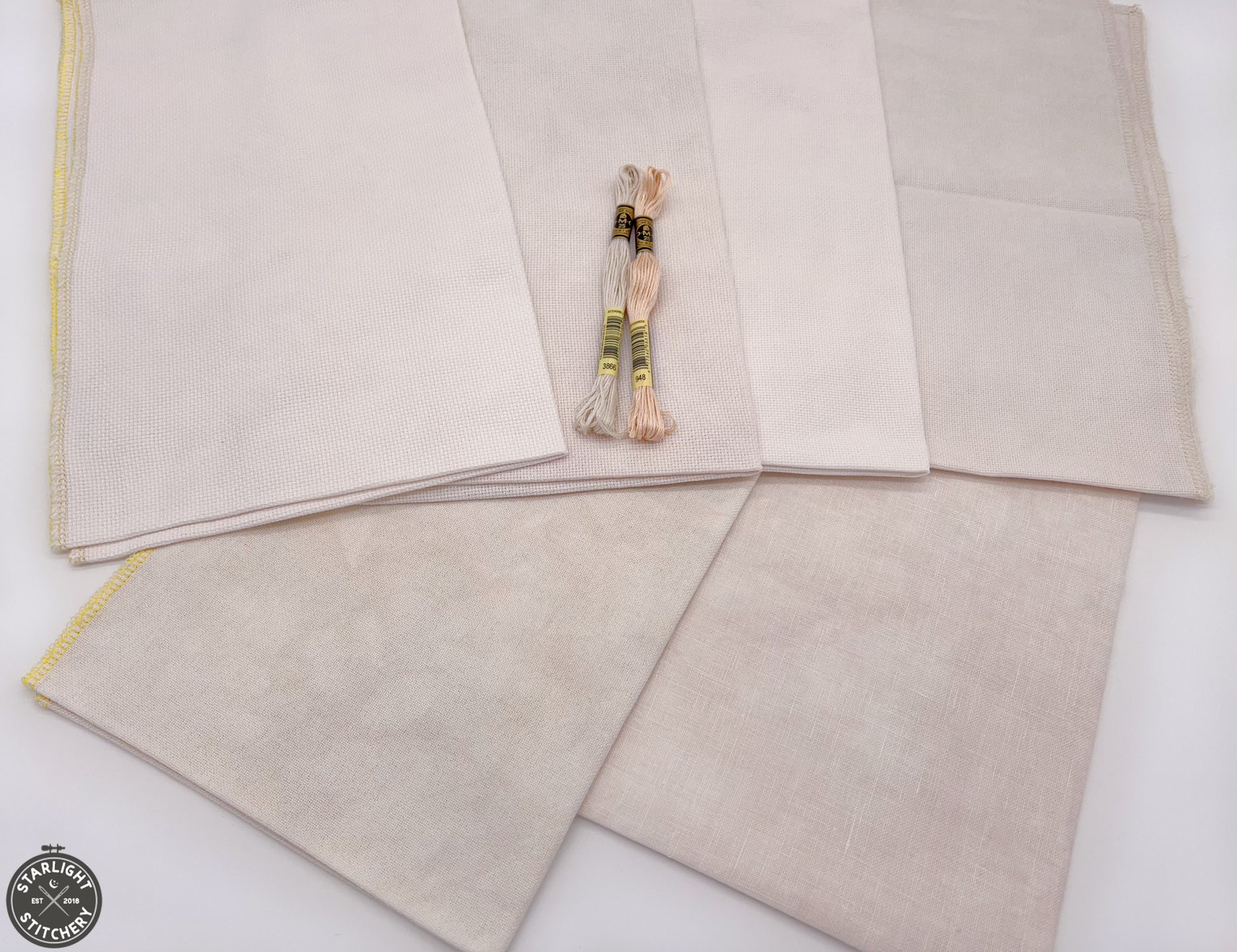 Fabric order in photograph, from top: 14 ct Aida, 16 ct Aida, 18 ct Aida, 20 ct Aida, 28 ct Lugana, 36 ct linen.