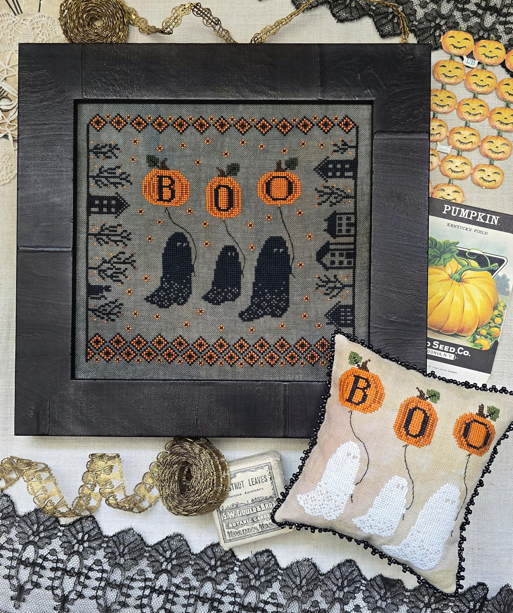 Model stitched on both a moody dark fabric as well as a lighter neutral, both are totally great! The small pillow follows the three ghost portion of the chart and makes the perfect small pillow or bowl filler! I trimmed my pillow with black seed beads for a decorative touch.