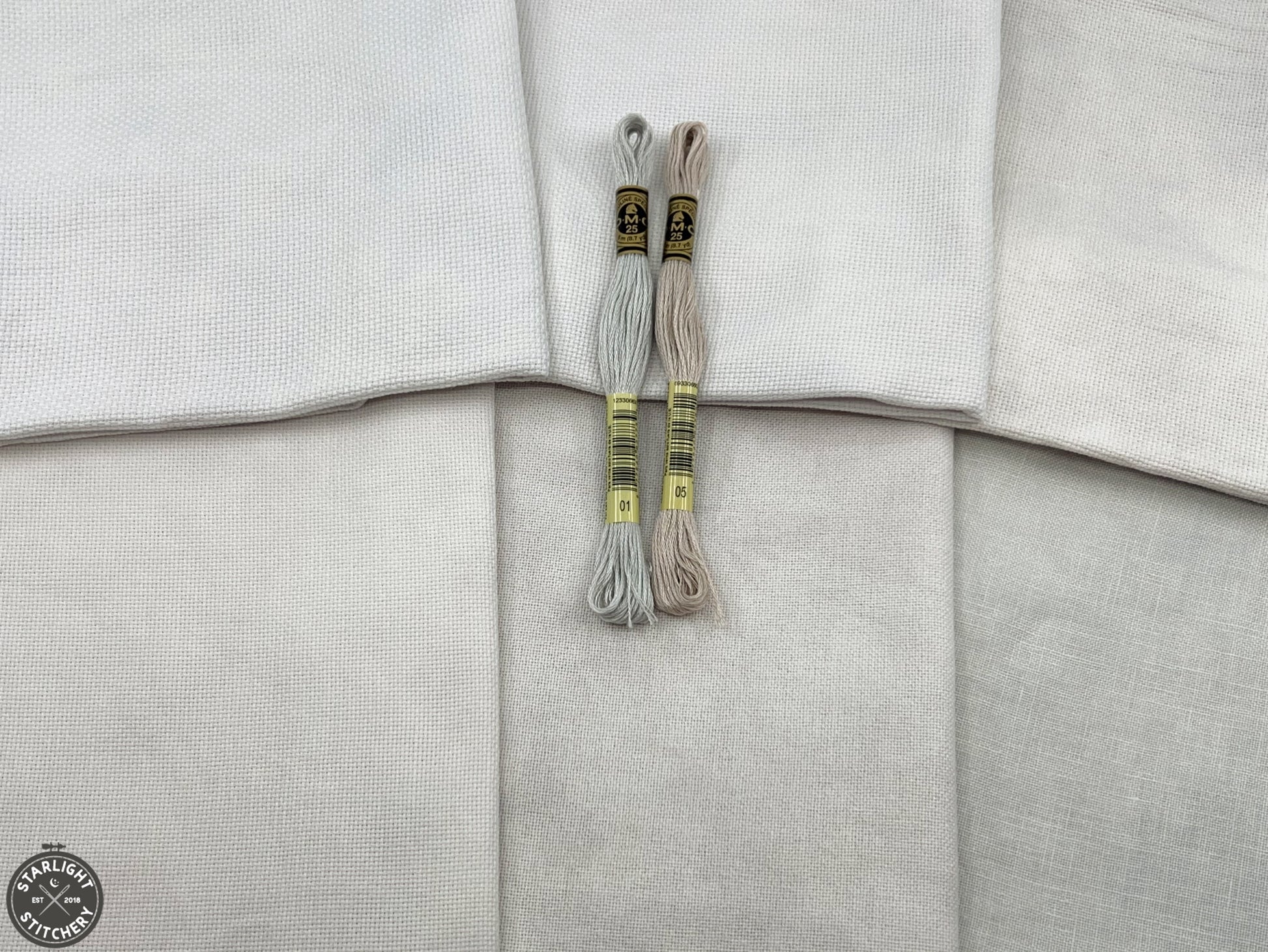 Fabric order in photograph, top L to R: 14 ct Aida, 16 ct Aida, 18 ct Aida; bottom L to R: 20 ct Aida, 28 ct Lugana, 36 ct linen.