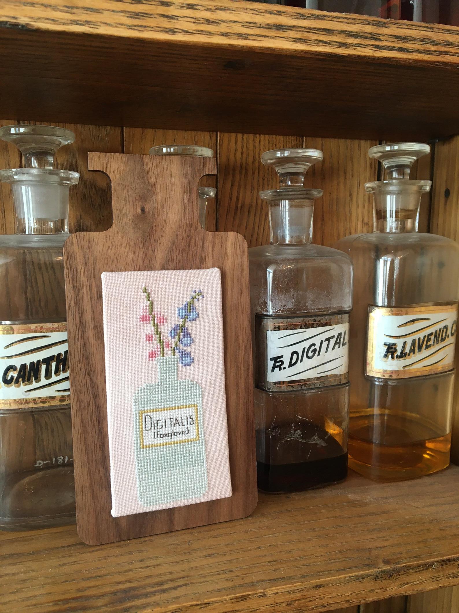 Third in the Perennial Potions series. This cross stitch design features an old apothecary bottle with the Foxglove plant sprouting from the mouth of the bottle.