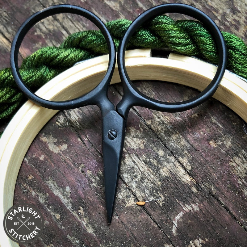 Miniature scissors with regular handle holes. At 2.5" long, these little snips are perfect for stitching on the go. Primitive finish; it is strongly recommended that you gently wipe these scissors with a warm, damp cloth prior to the first use, given their unique matte finish.