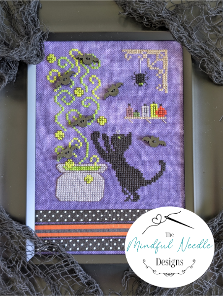 This mischievious cat has brewed up a real batch of trouble. The design was worked on 28 count Cashel in the color Crocus from Atomic Ranch Fabrics. Sullivans threads were used and DMC equivalents are provided. Six bat buttons (from Willoughby Ann) are included with each pattern. Stitch count: 54 W x 70 H.