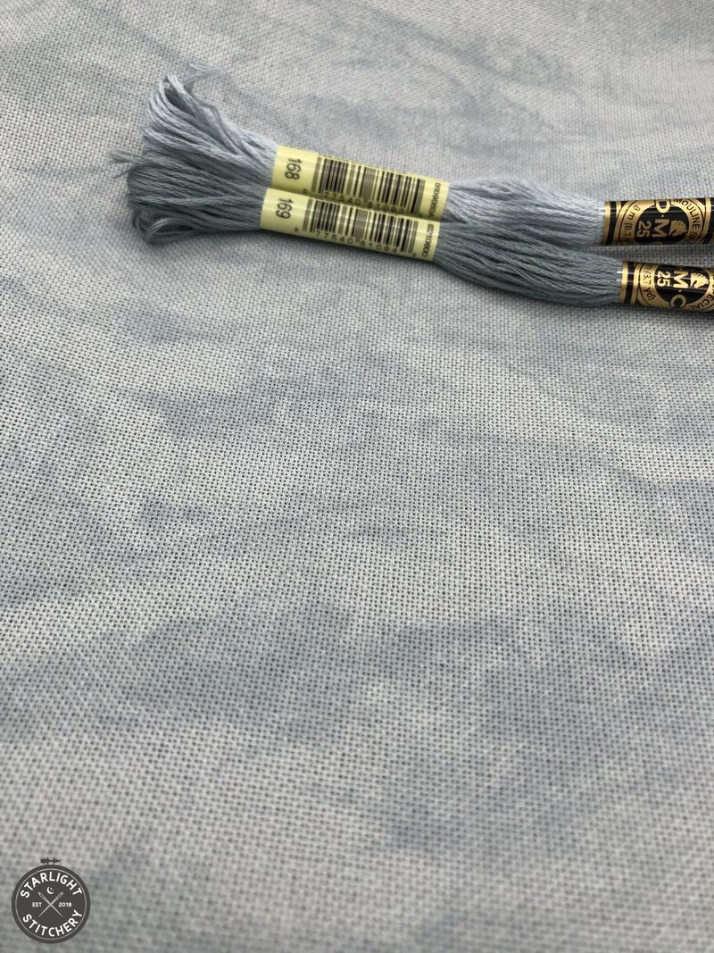 Pale grey with darker grey mottling. Similar to DMC 01 and 02. The linen is slightly darker and blue-toned, closer to DMC 168/169.